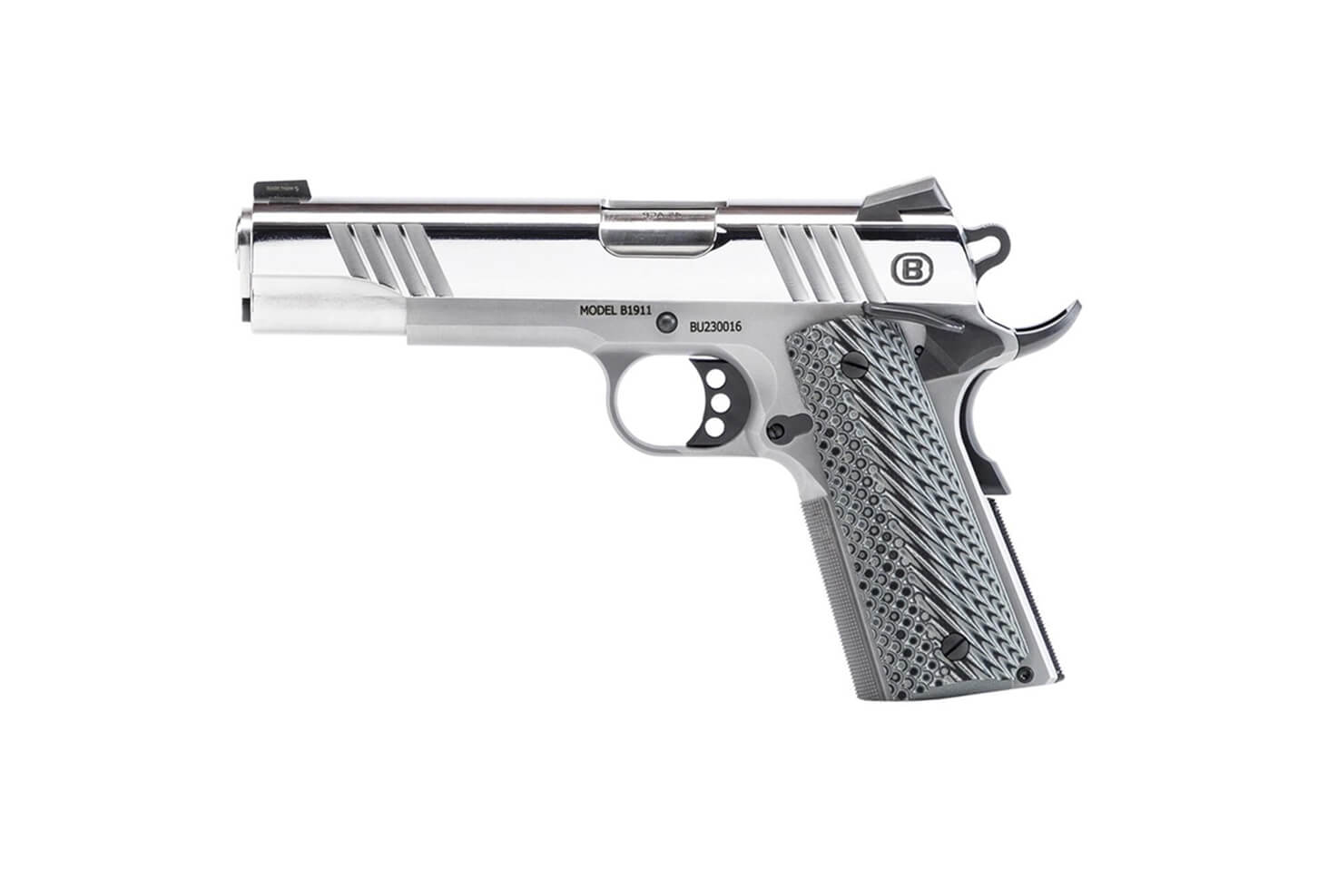 Fabricadas en acero inoxidable 416 y recamaradas en .45 ACP, todas las 1911 de la serie B1911 cuentan con empuñaduras VZ para una mejor textura de agarre, miras nocturnas de tritio en cola de milano, beavertail extendido y seguros ambidiestros extendidos para asegurar un mejor grip.