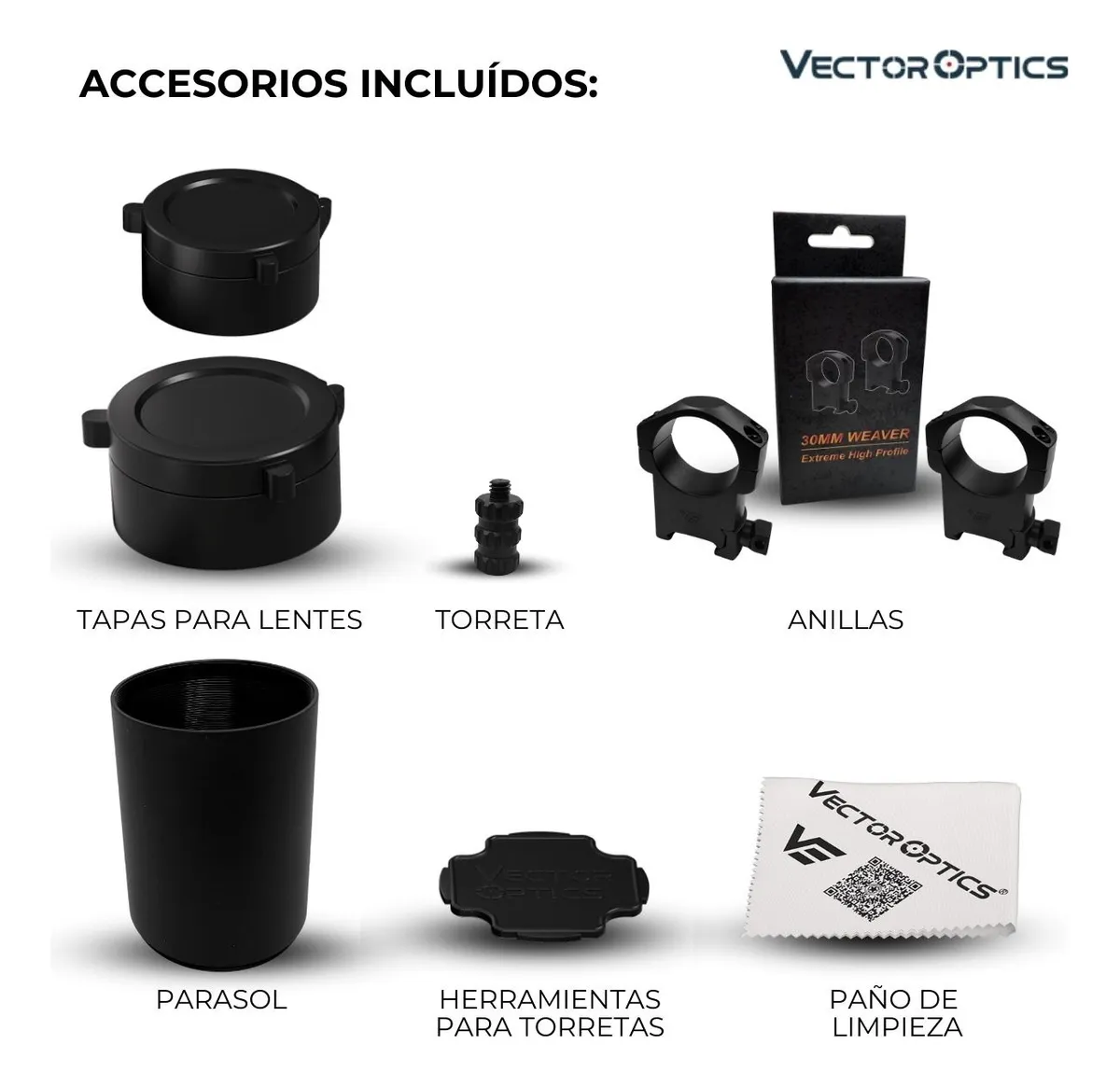 o Incluye: Manual de usuario, paño de limpieza, llave plástica, parasol, palanca de zoom, anillas Weaver 30 mm y accesorios.